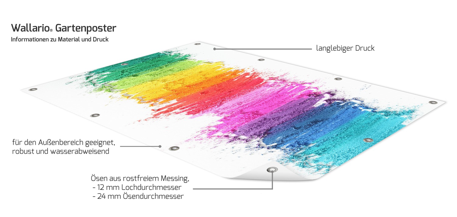 Sie erhalten dieses Poster für den Außenbereich in höchster Druckqualität. Das Motiv wird auf robustes Kunststoffmaterial gedruckt, die verwendeten Farben sind witterungsbeständig und überzeugen durch ihre Brillanz. Ihr Gartenposter ist bereits mit Metallösen zum Aufhängen versehen. Bei rechteckigen Postern werden die Ränder ab einer Kantenlänge von 2 m zusätzlich gesäumt, um die Stabilität zu verbessern. Perfekt für den Garten als Verschönerung für Sichtschutzelemente, Zäune, Mauern, Garagen oder den Balkon.