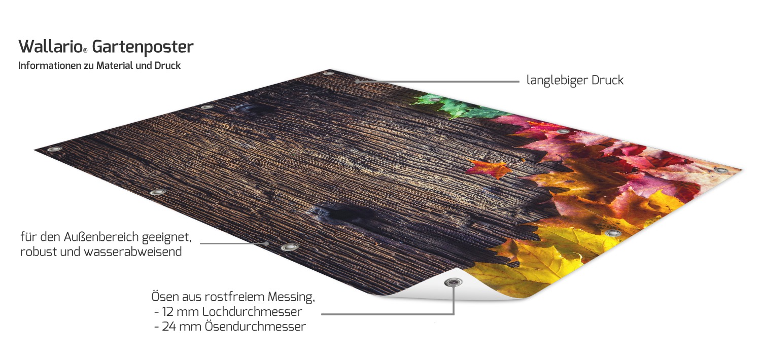 Sie erhalten dieses Poster für den Außenbereich in höchster Druckqualität. Das Motiv wird auf robustes Kunststoffmaterial gedruckt, die verwendeten Farben sind witterungsbeständig und überzeugen durch ihre Brillanz. Ihr Gartenposter ist bereits mit Metallösen zum Aufhängen versehen. Bei rechteckigen Postern werden die Ränder ab einer Kantenlänge von 2 m zusätzlich gesäumt, um die Stabilität zu verbessern. Perfekt für den Garten als Verschönerung für Sichtschutzelemente, Zäune, Mauern, Garagen oder den Balkon.