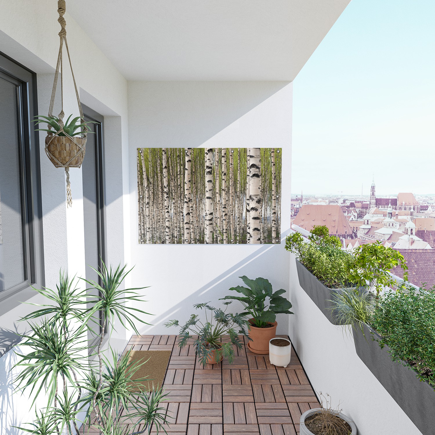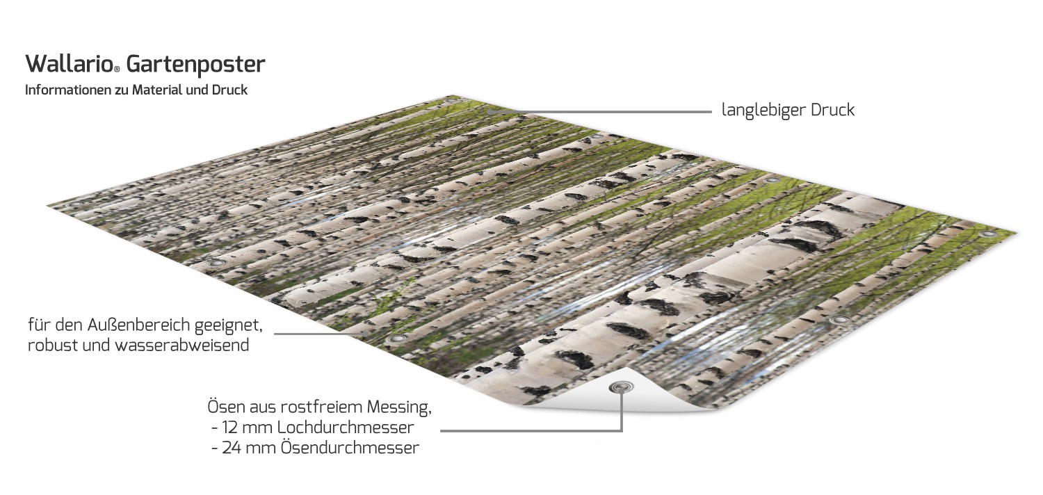 Sie erhalten dieses Poster für den Außenbereich in höchster Druckqualität. Das Motiv wird auf robustes Kunststoffmaterial gedruckt, die verwendeten Farben sind witterungsbeständig und überzeugen durch ihre Brillanz. Ihr Gartenposter ist bereits mit Metallösen zum Aufhängen versehen. Bei rechteckigen Postern werden die Ränder ab einer Kantenlänge von 2 m zusätzlich gesäumt, um die Stabilität zu verbessern. Perfekt für den Garten als Verschönerung für Sichtschutzelemente, Zäune, Mauern, Garagen oder den Balkon.
