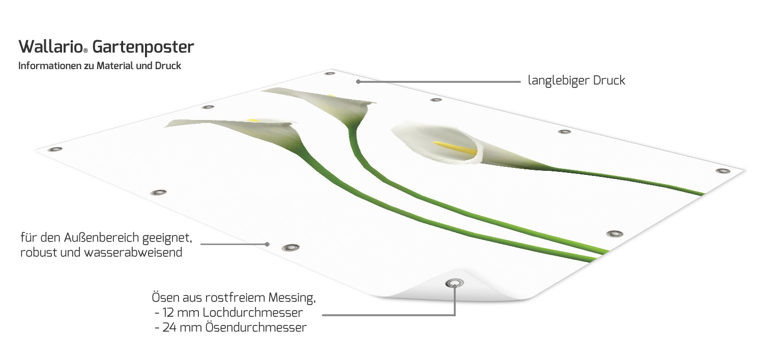 Sie erhalten dieses Poster für den Außenbereich in höchster Druckqualität. Das Motiv wird auf robustes Kunststoffmaterial gedruckt, die verwendeten Farben sind witterungsbeständig und überzeugen durch ihre Brillanz. Ihr Gartenposter ist bereits mit Metallösen zum Aufhängen versehen. Bei rechteckigen Postern werden die Ränder ab einer Kantenlänge von 2 m zusätzlich gesäumt, um die Stabilität zu verbessern. Perfekt für den Garten als Verschönerung für Sichtschutzelemente, Zäune, Mauern, Garagen oder den Balkon.