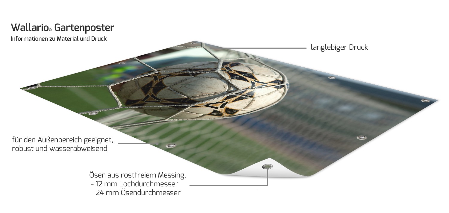 Sie erhalten dieses Poster für den Außenbereich in höchster Druckqualität. Das Motiv wird auf robustes Kunststoffmaterial gedruckt, die verwendeten Farben sind witterungsbeständig und überzeugen durch ihre Brillanz. Ihr Gartenposter ist bereits mit Metallösen zum Aufhängen versehen. Bei rechteckigen Postern werden die Ränder ab einer Kantenlänge von 2 m zusätzlich gesäumt, um die Stabilität zu verbessern. Perfekt für den Garten als Verschönerung für Sichtschutzelemente, Zäune, Mauern, Garagen oder den Balkon.