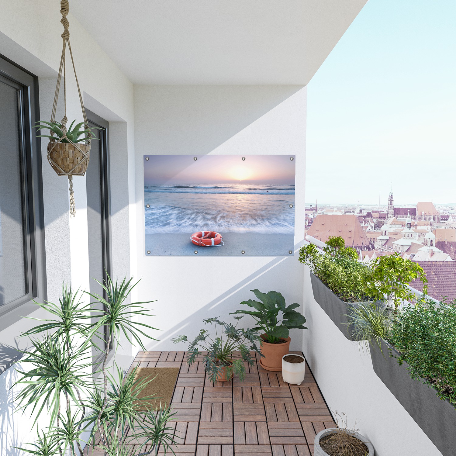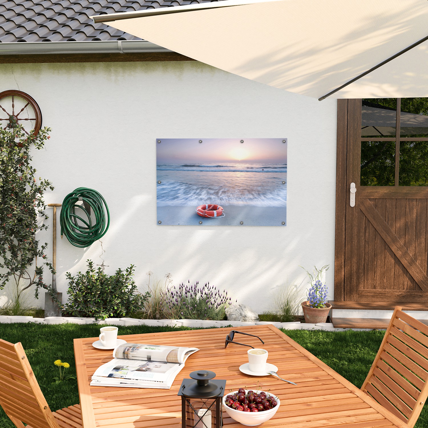 Gartenposter Rettungsring am Strand bei Sonnenuntergang 80 x 120 cm