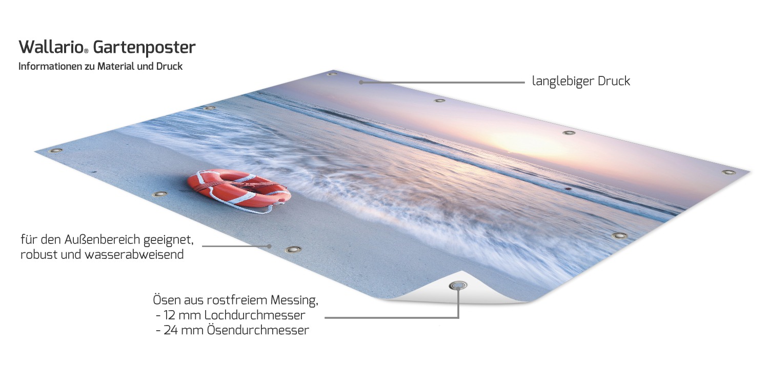 Sie erhalten dieses Poster für den Außenbereich in höchster Druckqualität. Das Motiv wird auf robustes Kunststoffmaterial gedruckt, die verwendeten Farben sind witterungsbeständig und überzeugen durch ihre Brillanz. Ihr Gartenposter ist bereits mit Metallösen zum Aufhängen versehen. Bei rechteckigen Postern werden die Ränder ab einer Kantenlänge von 2 m zusätzlich gesäumt, um die Stabilität zu verbessern. Perfekt für den Garten als Verschönerung für Sichtschutzelemente, Zäune, Mauern, Garagen oder den Balkon.