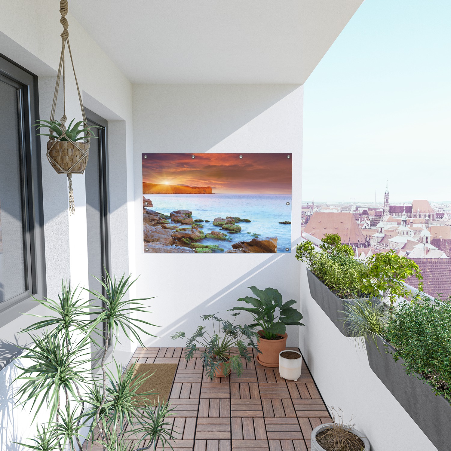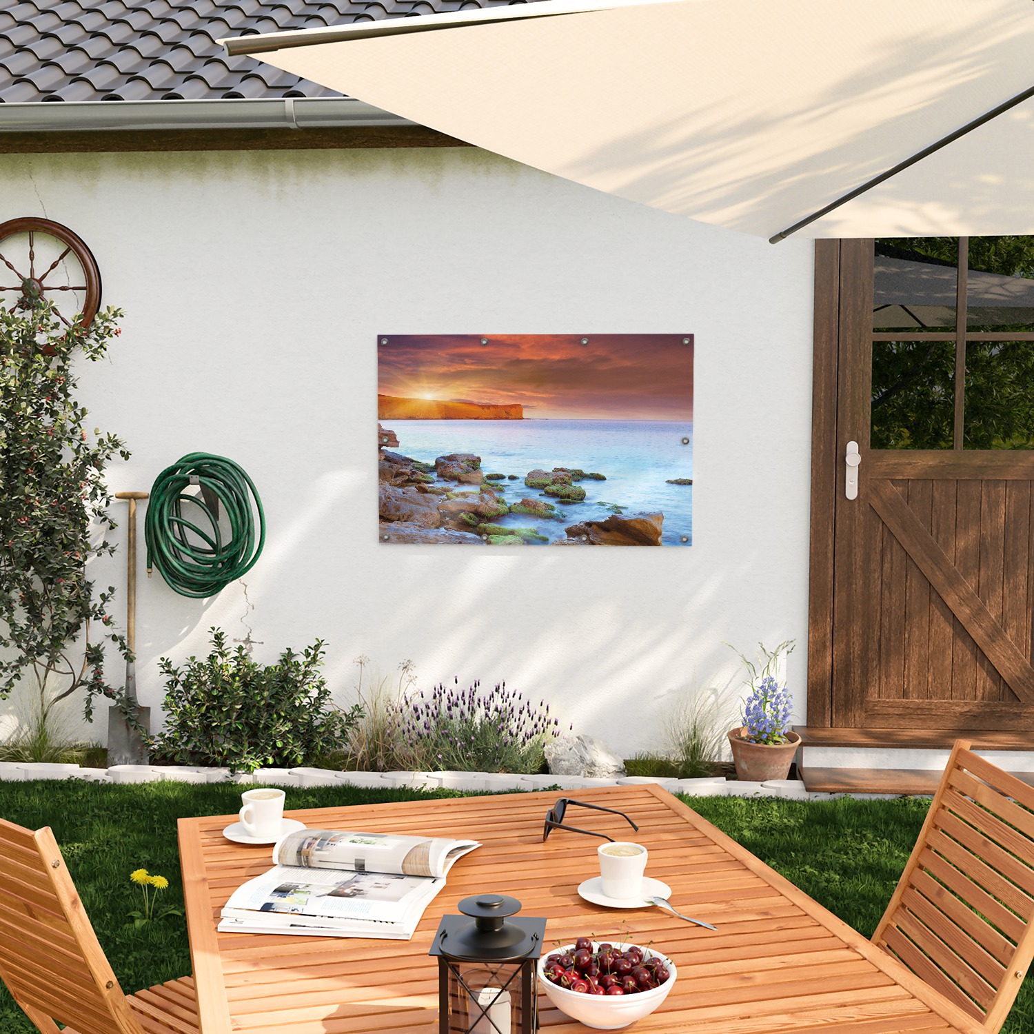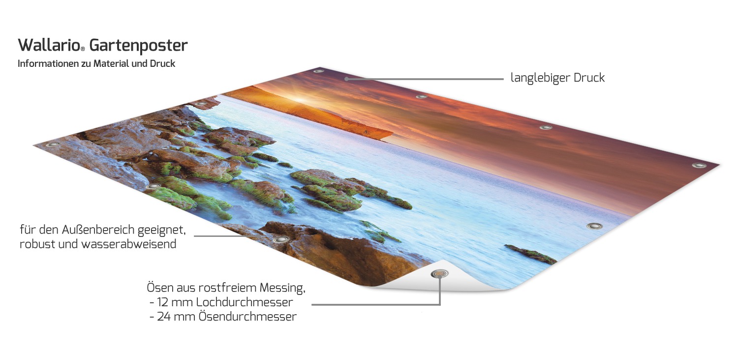 Sie erhalten dieses Poster für den Außenbereich in höchster Druckqualität. Das Motiv wird auf robustes Kunststoffmaterial gedruckt, die verwendeten Farben sind witterungsbeständig und überzeugen durch ihre Brillanz. Ihr Gartenposter ist bereits mit Metallösen zum Aufhängen versehen. Bei rechteckigen Postern werden die Ränder ab einer Kantenlänge von 2 m zusätzlich gesäumt, um die Stabilität zu verbessern. Perfekt für den Garten als Verschönerung für Sichtschutzelemente, Zäune, Mauern, Garagen oder den Balkon.