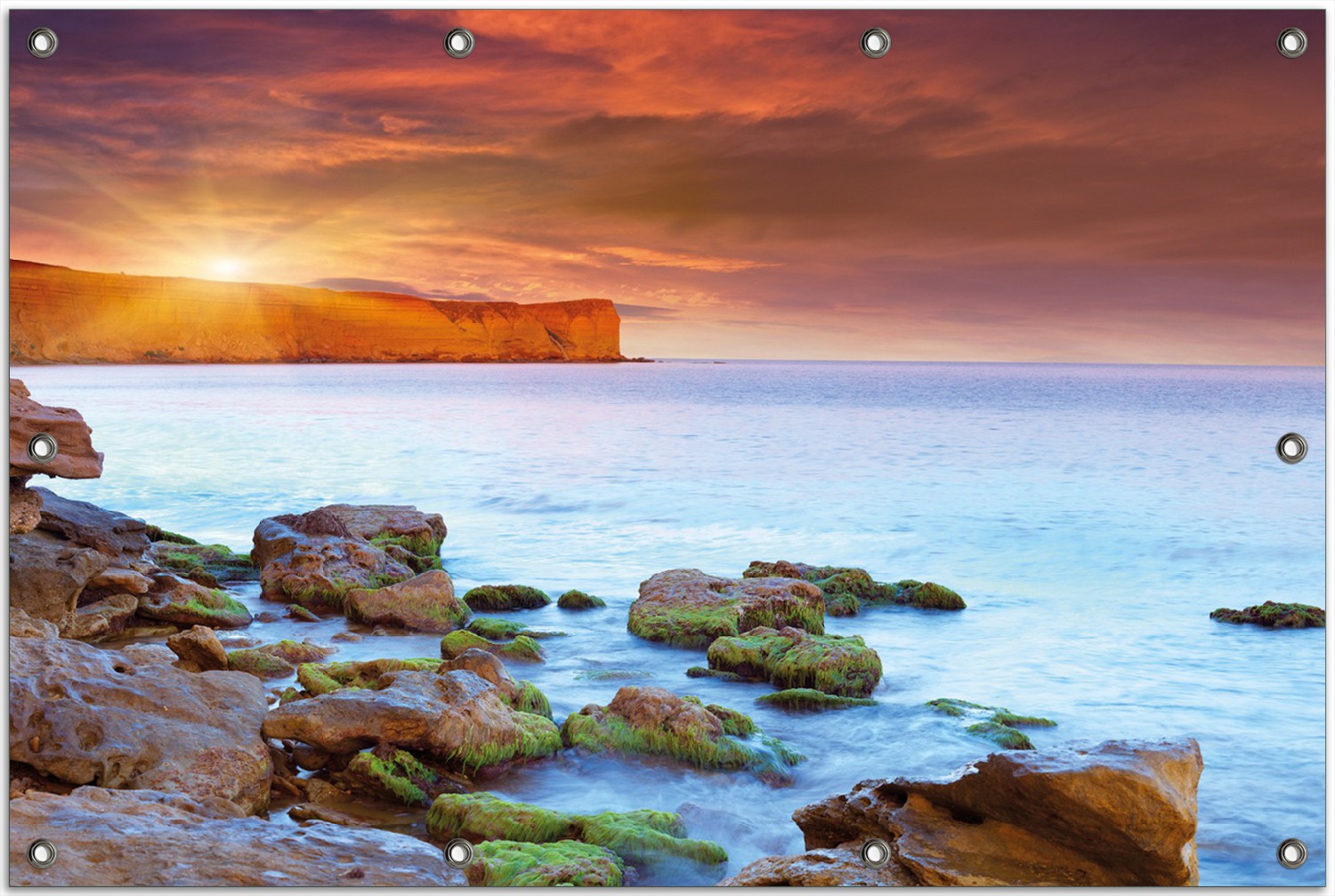 Gartenposter Sonnenaufgang am Meer mit Landzunge und Felsen im Wasser 80 x 120 cm