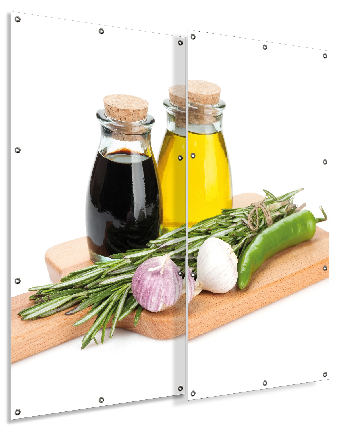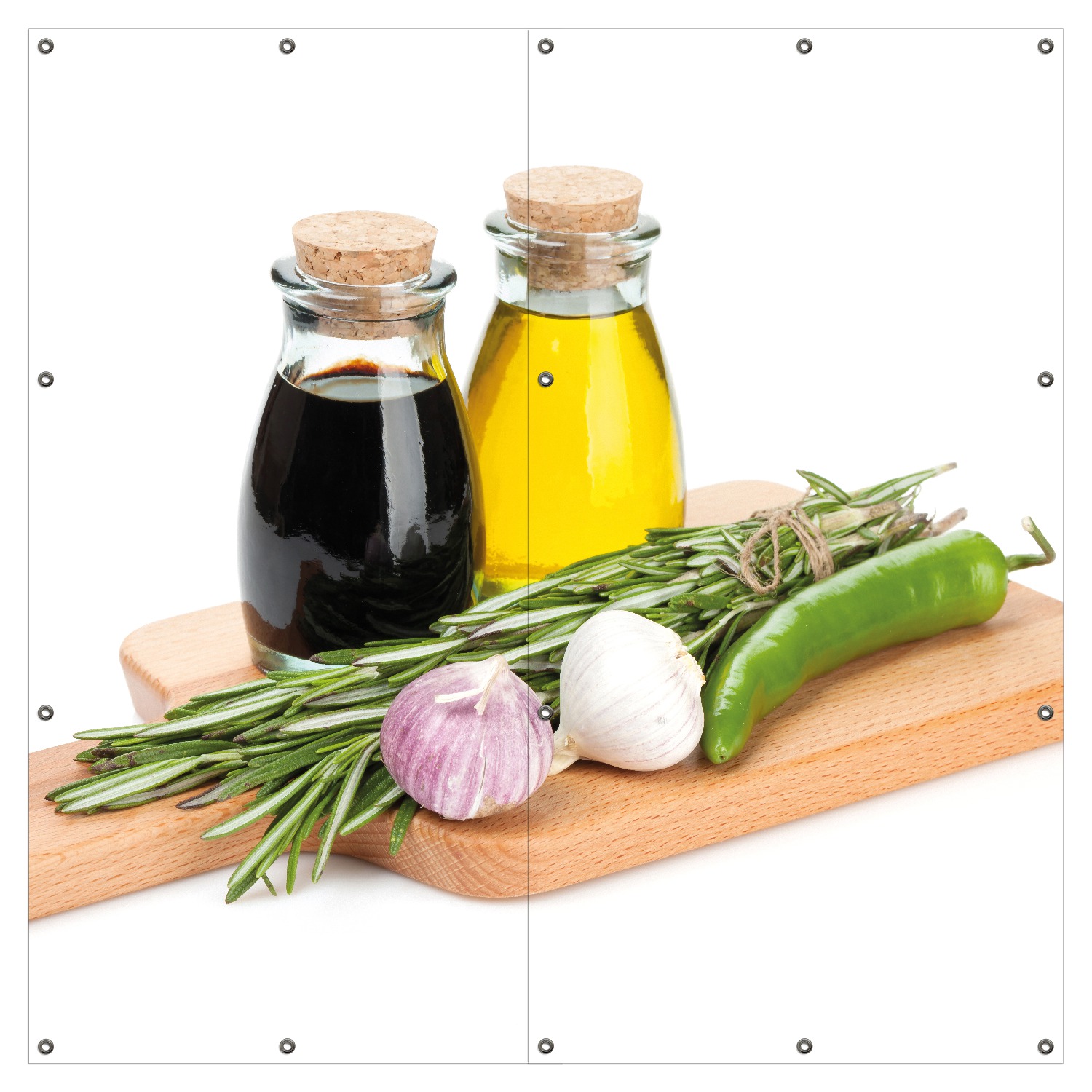 Gartenposter Gewürze, Kräuter und Öle auf einem Holz-Schneidebrett 180 x 180 cm. 2-teilig