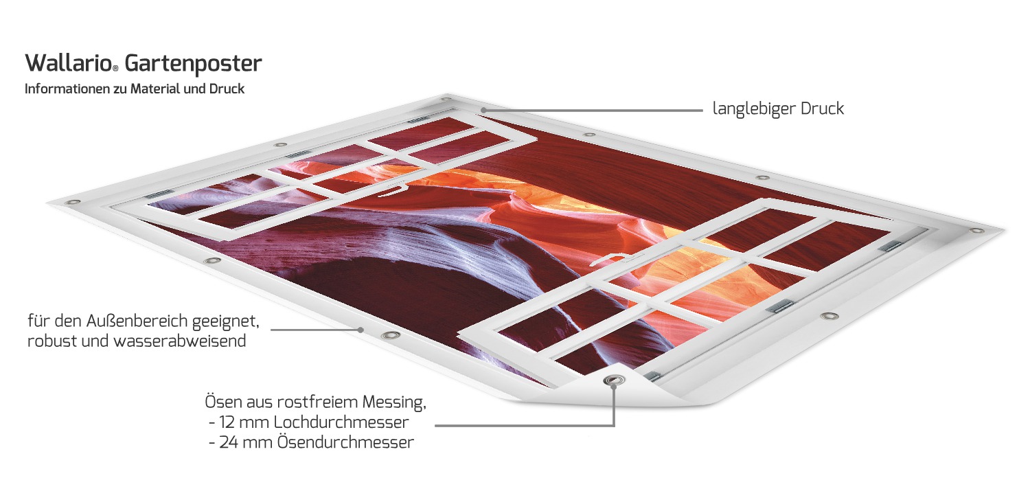 Sie erhalten dieses Poster für den Außenbereich in höchster Druckqualität. Das Motiv wird auf robustes Kunststoffmaterial gedruckt, die verwendeten Farben sind witterungsbeständig und überzeugen durch ihre Brillanz. Ihr Gartenposter ist bereits mit rostfreien Metallösen zum Aufhängen versehen. Der Artikel wird in einem Stück geliefert. Perfekt für den Garten als Verschönerung für Sichtschutzelemente, Zäune, Mauern, Garagen oder den Balkon.